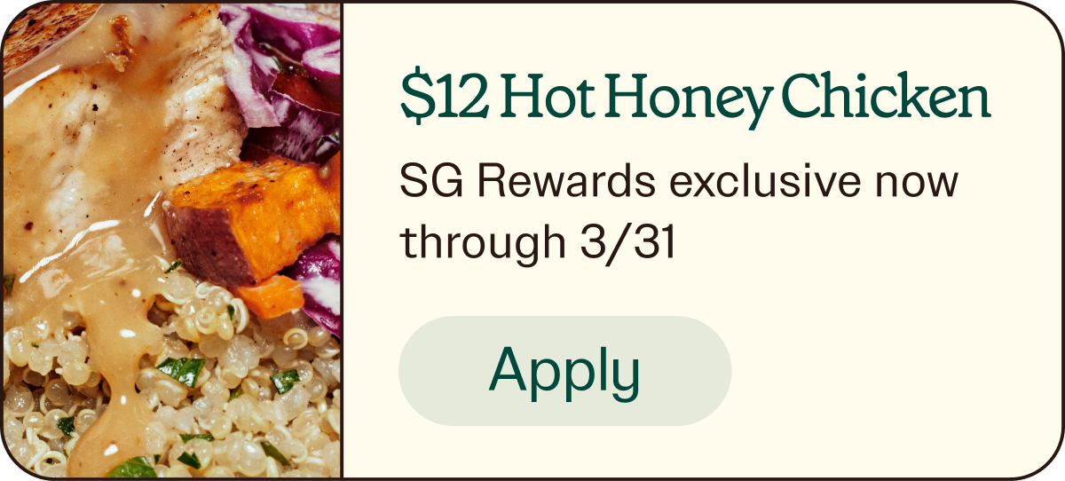 *While supplies last. Limit 1 per order. Offer valid through 3/31. Excludes taxes, delivery, and other fees. Restrictions may apply. Apply reward at checkout. Excludes third-party delivery services. Modifications void offer price. See SG Rewards Terms and $12 Hot Honey Chicken Plate Terms for details.